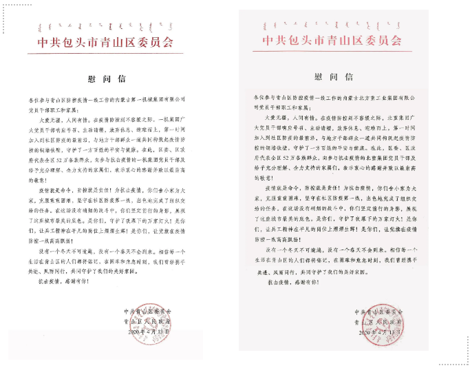 一機集團、北重集團收到中共包頭市青山區委員會、青山區人民政府發來的慰問信 信中指出,在青山區抗擊疫情最緊要的關頭,一機集團、北重集團雪中送炭、迅速響應,分別緊急抽調百余名黨員干部參與到地區疫情防控工作中,為全區上下眾志成城,打贏疫情防控的人民戰爭、總體戰、阻擊戰增添了寶貴力量,有力支持了全區疫情防控工作,彰顯了一機集團、北重集團在公共危機面前挺膺負責、挺身而出的社會責任,胸懷大局、無私奉獻的社會擔當。 一機集團黨員干部馳援青山區疫情防控一線 北重集團黨員干部馳援青山區疫情防控一線 來源/豫西集團紅宇專汽公司、一機集團、北重集團
