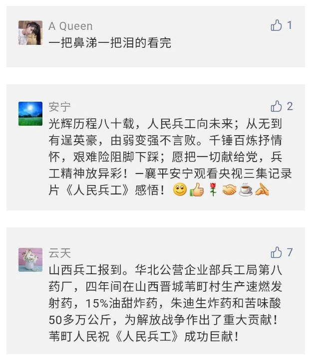 在中國(guó)共產(chǎn)黨成立九十九周年之際,由中國(guó)兵器工業(yè)集團(tuán)有限公司組織攝制、反映人民兵工在黨的領(lǐng)導(dǎo)下80余年光輝奮斗歷程、廣大兵工人弘揚(yáng)“把一切獻(xiàn)給黨”人民兵工精神的三集紀(jì)錄片《人民兵工》自7月1日-3日每晚20點(diǎn)在中央廣播電視總臺(tái)中文國(guó)際頻道(CCTV-4)《國(guó)家記憶》首播以來(lái),在兵器系統(tǒng)和觀眾中引發(fā)強(qiáng)烈反響,很多網(wǎng)友、觀眾紛紛留言表達(dá)了自己的觀后感受。 觀眾在兵器工業(yè)集團(tuán)官微的留言區(qū)直抒了觀影感受,有的熱淚盈眶,有的心潮起伏,有的興起賦詩(shī),有的認(rèn)為讓心靈得到凈化、思想得以提升,有的認(rèn)為是最直觀的國(guó)防教育教材......
