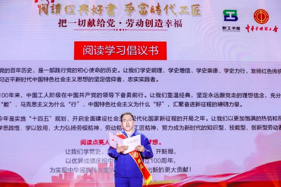 全國(guó)勞動(dòng)模范、兵器工業(yè)集團(tuán)北方車輛集團(tuán)職工馬小光宣讀參加“把一切獻(xiàn)給黨·勞動(dòng)創(chuàng)造幸福”全國(guó)職工黨史學(xué)習(xí)教育讀書活動(dòng)倡議書