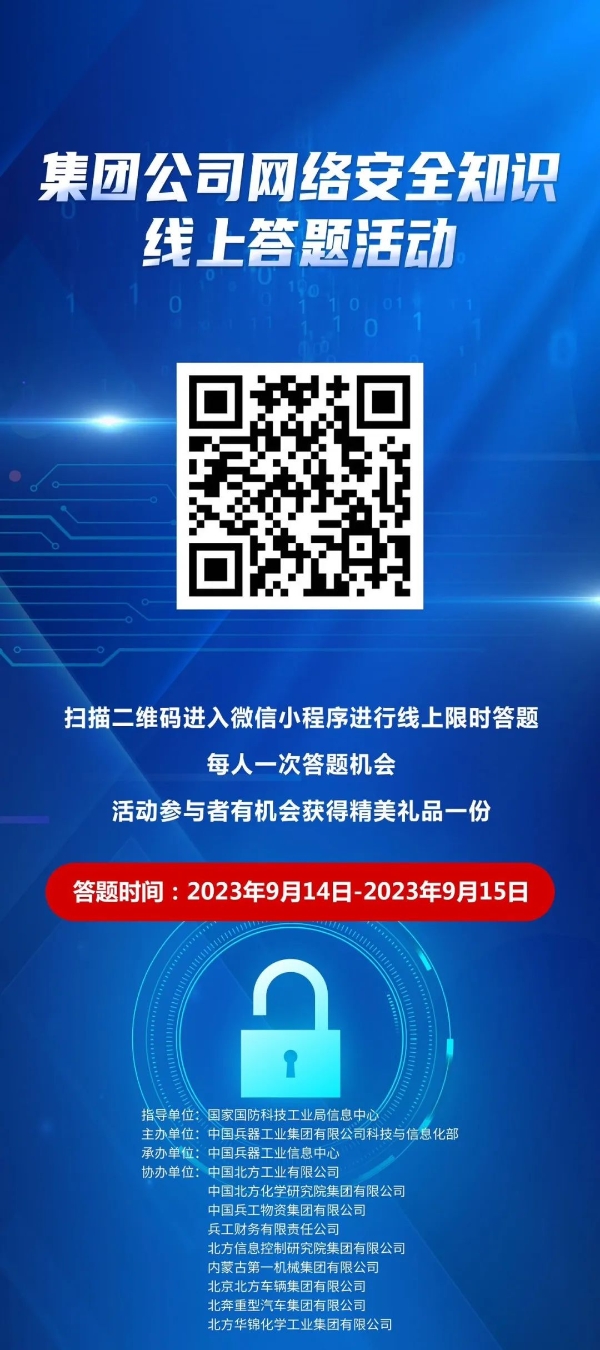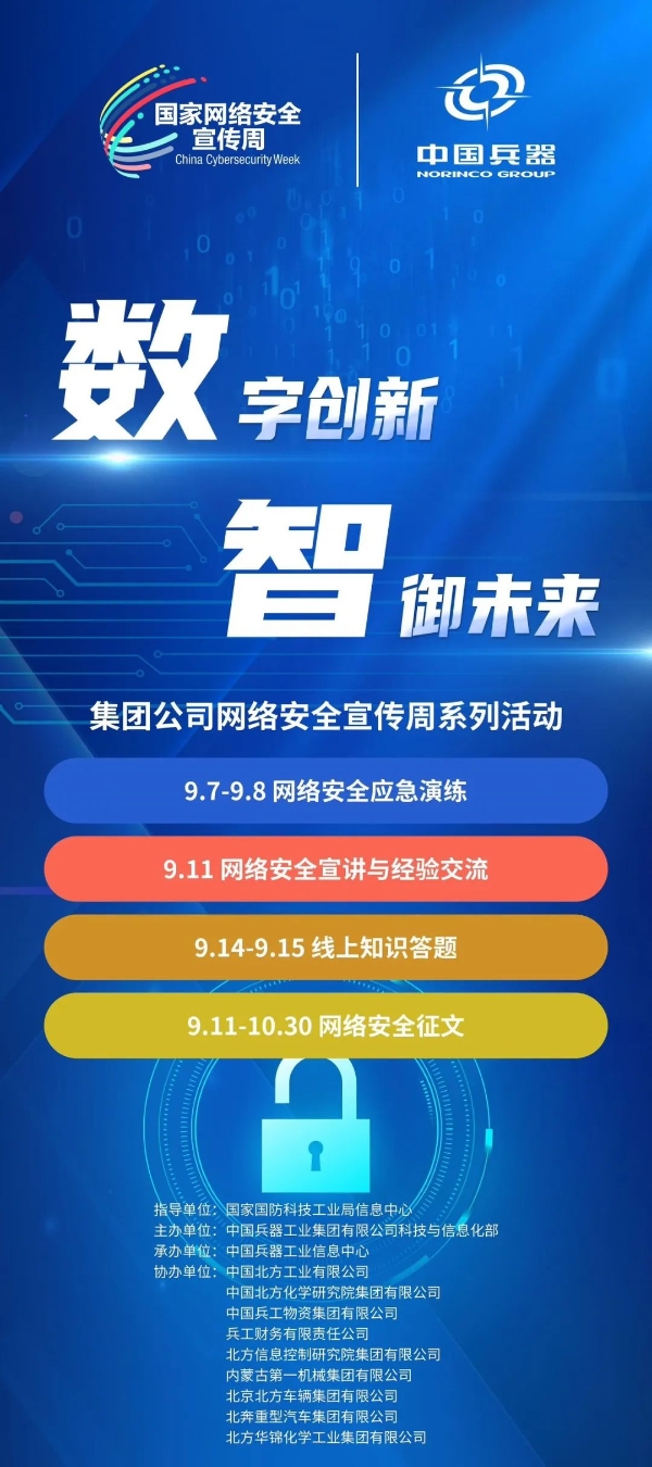 9月11日至17日,中國兵器工業集團有限公司以“數字創新 智御未來”為主題,圍繞集團公司“1+5”戰略和“雙十”規劃,組織開展集團公司網絡安全宣傳周系列活動。