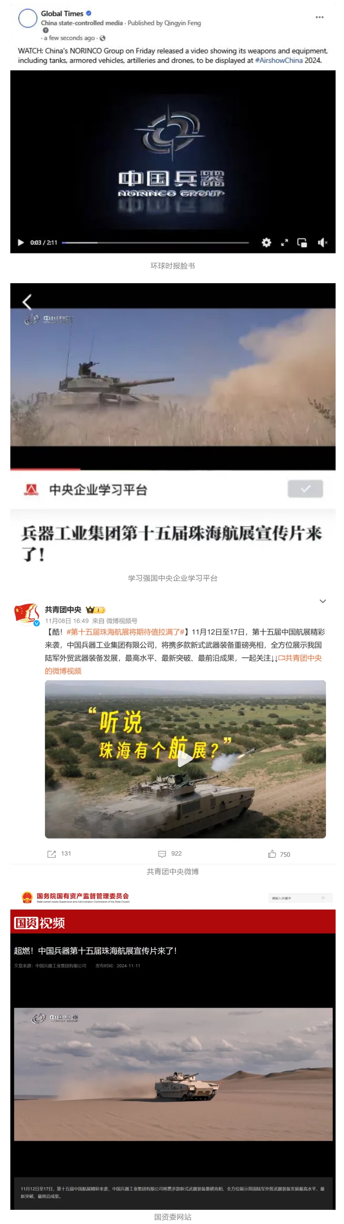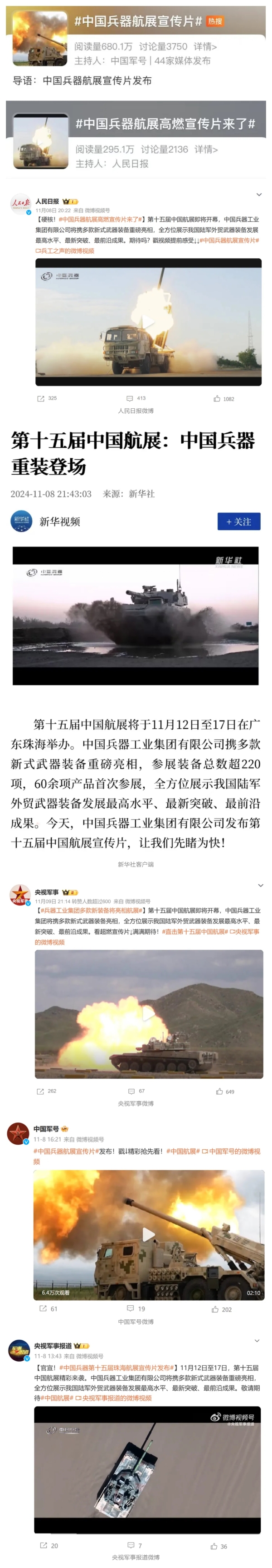 人民日報微博、新華社客戶端、央視軍事微博、中國軍號微博、央視軍事報道微博、中國日報微博、中國新聞網(wǎng)、中國青年報-青蜂俠、環(huán)球網(wǎng)、環(huán)球時報(臉書、X平臺)、學習強國中央企業(yè)學習平臺、共青團中央微博、國資委網(wǎng)站等20余家中央主流媒體、國家部委的新媒體第一時間播發(fā)集團公司航展宣傳片等視頻作品燃爆全網(wǎng),累計閱讀量突破1200萬人次。集團公司微信公眾號、微博、抖音號、快手號、微信視頻號、知乎號等新媒體宣傳片播放閱讀量近1000萬人次,點贊近20萬人次。