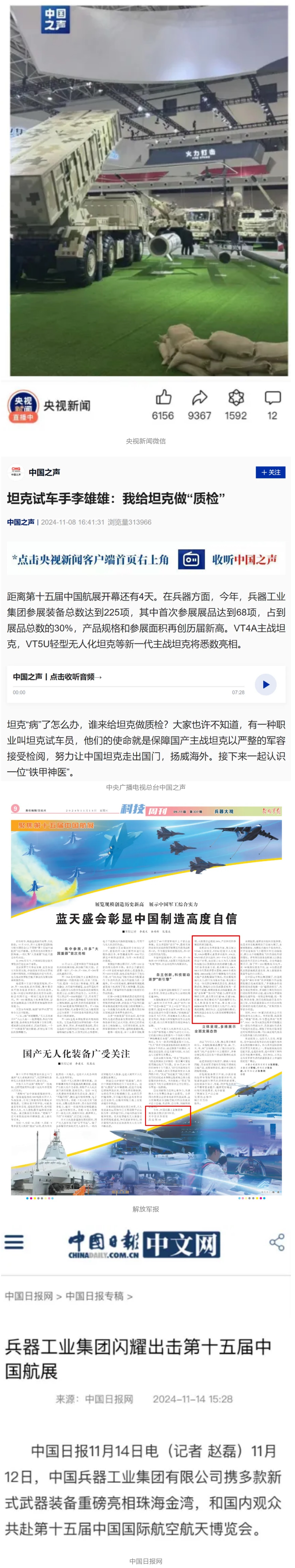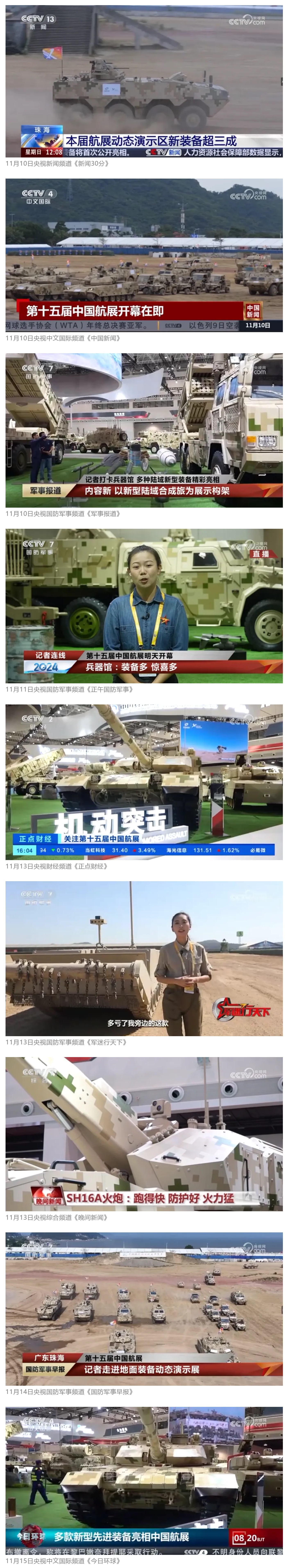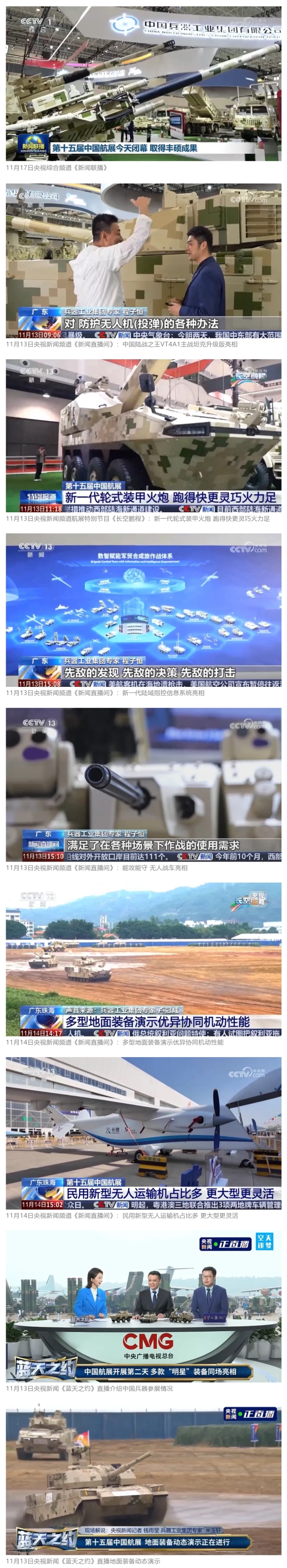 11月13日央視新聞《藍天之約》直播地面裝備動態(tài)演示此次航展,央視綜合頻道《新聞聯(lián)播》《晚間新聞》、新聞頻道《新聞直播間》《新聞30分》《朝聞天下》《共同關注》《東方時空》《午夜新聞》、財經(jīng)頻道《天下財經(jīng)》《經(jīng)濟信息聯(lián)播》《正點財經(jīng)》《第一時間》、中文國際頻道《今日環(huán)球》《中國新聞》、國防軍事頻道《軍事報道》《正午國防軍事》《國防軍事早報》《軍迷行天下》等欄目共播出兵器工業(yè)集團參展相關新聞報道40余條。11月10日央視新聞頻道《新聞30分》11月10日央視中文國際頻道《中國新聞》11月10日央視國防軍事頻道《軍事報道》11月11日央視國防軍事頻道《正午國防軍事》