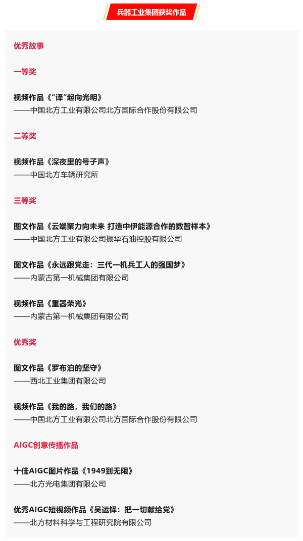 12月3日,由國務院國資委宣傳局、人民網聯合主辦的“砥礪七十五載 譜寫央企擔當”第七屆中央企業優秀故事暨AIGC創意傳播作品發布展示活動在京舉行,中國兵器工業集團有限公司共有9件作品獲獎,其中,優秀故事一等獎1項、二等獎1項、三等獎3項、優秀獎2項,十佳AIGC圖片作品1項、優秀AIGC短視頻作品1項。