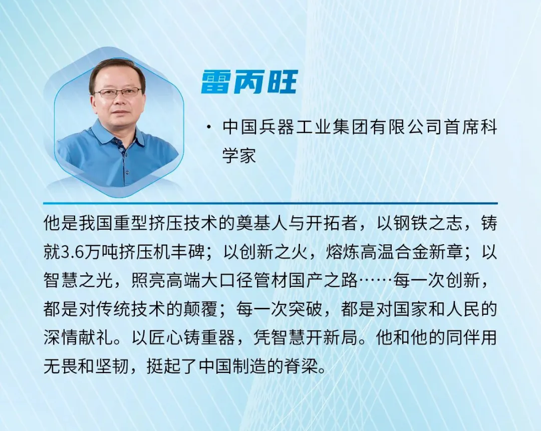雷丙旺是我國極端金屬擠壓技術(shù)的開拓者,扎根邊疆地區(qū)國防特大型企業(yè)工作38年,長期從事金屬成形制造裝備與工藝研究工作。他研制出我國極限制造的大國重器——3.6萬噸黑色金屬垂直擠壓機(jī),一舉打破國外技術(shù)封鎖,填補(bǔ)國內(nèi)空白,實(shí)現(xiàn)了超(超)臨界電站核心管道和航空發(fā)動(dòng)機(jī)高壓渦輪盤粉末合金棒材的中國制造,開發(fā)出成套關(guān)鍵技術(shù),取得一系列原創(chuàng)性成果,促進(jìn)了產(chǎn)業(yè)的融合發(fā)展,創(chuàng)造巨大經(jīng)濟(jì)社會(huì)效益。