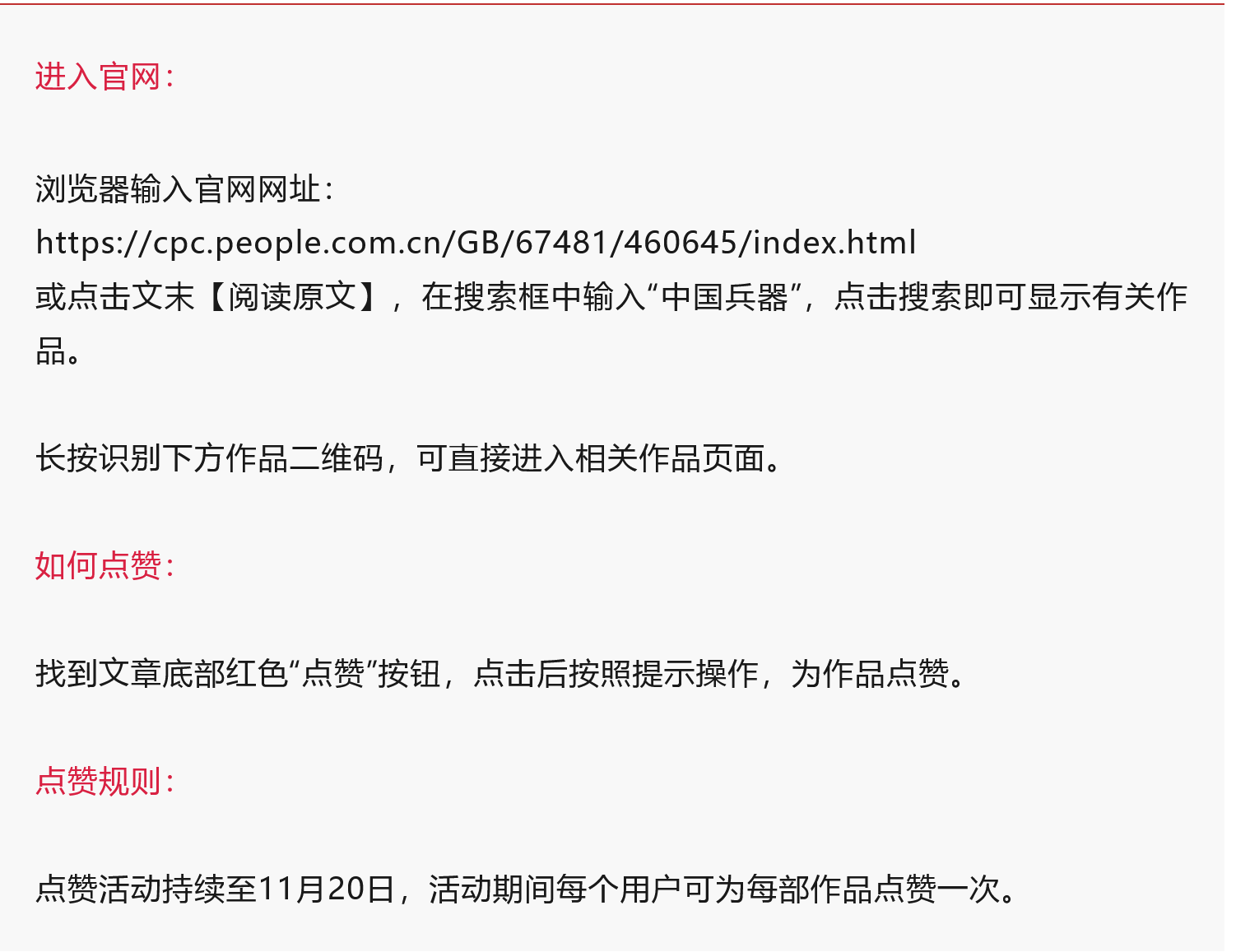 為持續(xù)提升中央企業(yè)整體形象,凝聚干事創(chuàng)業(yè)精神動力,助力“十四五”圓滿收官,推動“十五五”順利開局,今年6月,第八屆中央企業(yè)優(yōu)秀故事暨2025AIGC創(chuàng)意傳播作品征集展示活動正式啟動。本次活動以“決戰(zhàn)收官‘十四五’ 啟航奮進(jìn)開新篇”為主題,圍繞“五年成就”“時(shí)代擔(dān)當(dāng)”兩個(gè)維度進(jìn)行征集。鼓勵(lì)廣大中央企業(yè)以“輕量化、強(qiáng)互動”創(chuàng)新表達(dá)形式,增強(qiáng)吸引力感染力,充分展現(xiàn)中央企業(yè)精神面貌。參選作品擇優(yōu)在活動官網(wǎng)進(jìn)行集中展示,并將適時(shí)舉辦第八屆中央企業(yè)優(yōu)秀故事暨2025AIGC創(chuàng)意傳播作品發(fā)布活動,開展優(yōu)秀故事成果展、AIGC創(chuàng)意傳播成果專題展覽。 兵器工業(yè)集團(tuán)共有45部作品入選,歡迎大家一起來為“兵器好故事”點(diǎn)贊! 點(diǎn)贊方法