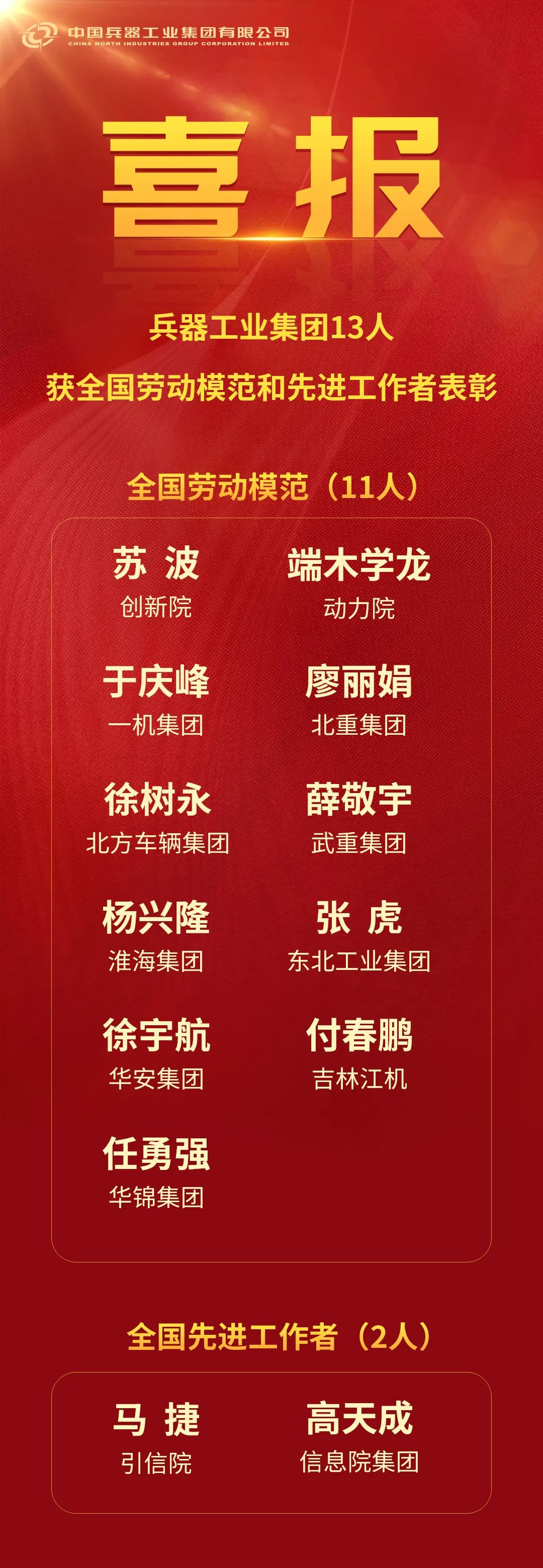 兵器工業(yè)集團(tuán)13人獲全國勞動模范和先進(jìn)工作者表彰